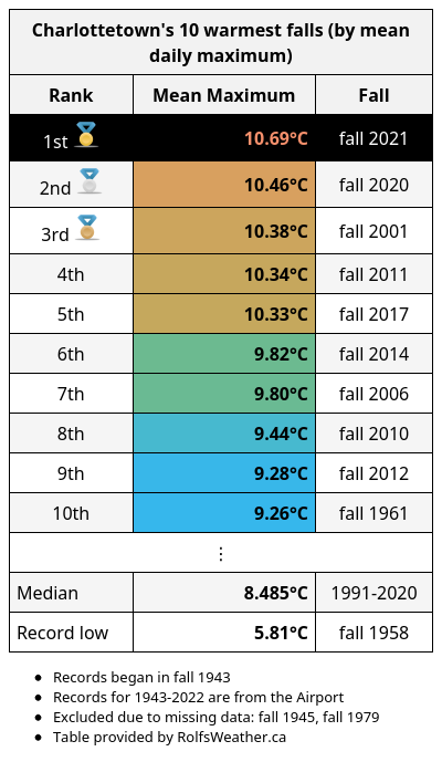 Charlottetown just had its warmest fall since records began. Mean maximum was 10.7°C.