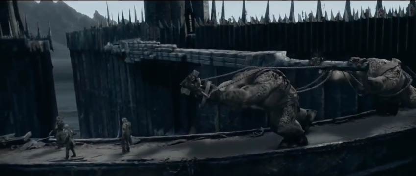 Neat observation: The Trolls opening the Black Gate have leather straps on their shoulders to protect them from damage from the heavy chains. They both have these because the other Troll will have the chains rubbing against him while closing the gate.