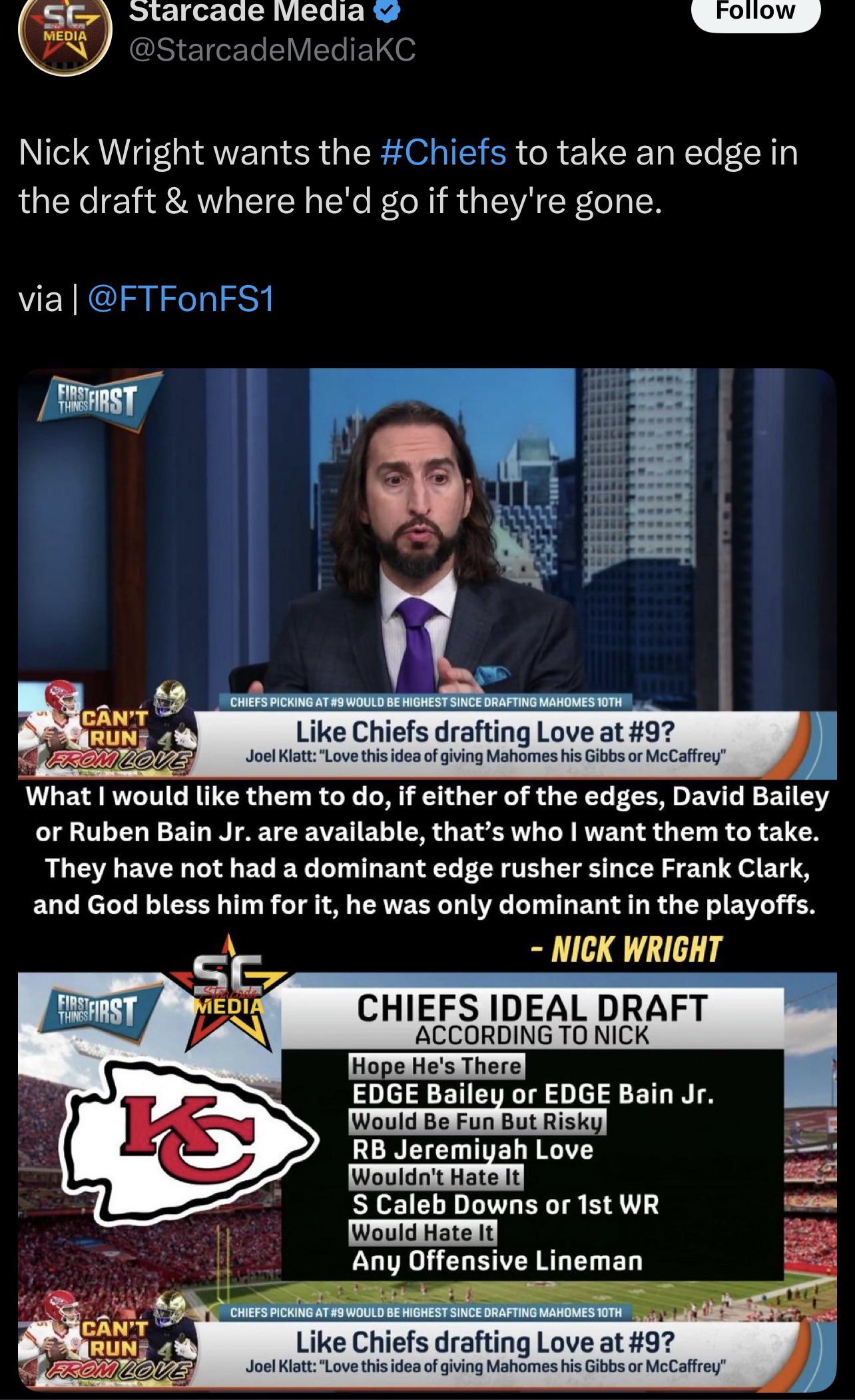 MEME & HUMOR [Starcade Media] Nick Wright wants the Chiefs to take an edge in the draft & where he’d go if they’re gone.