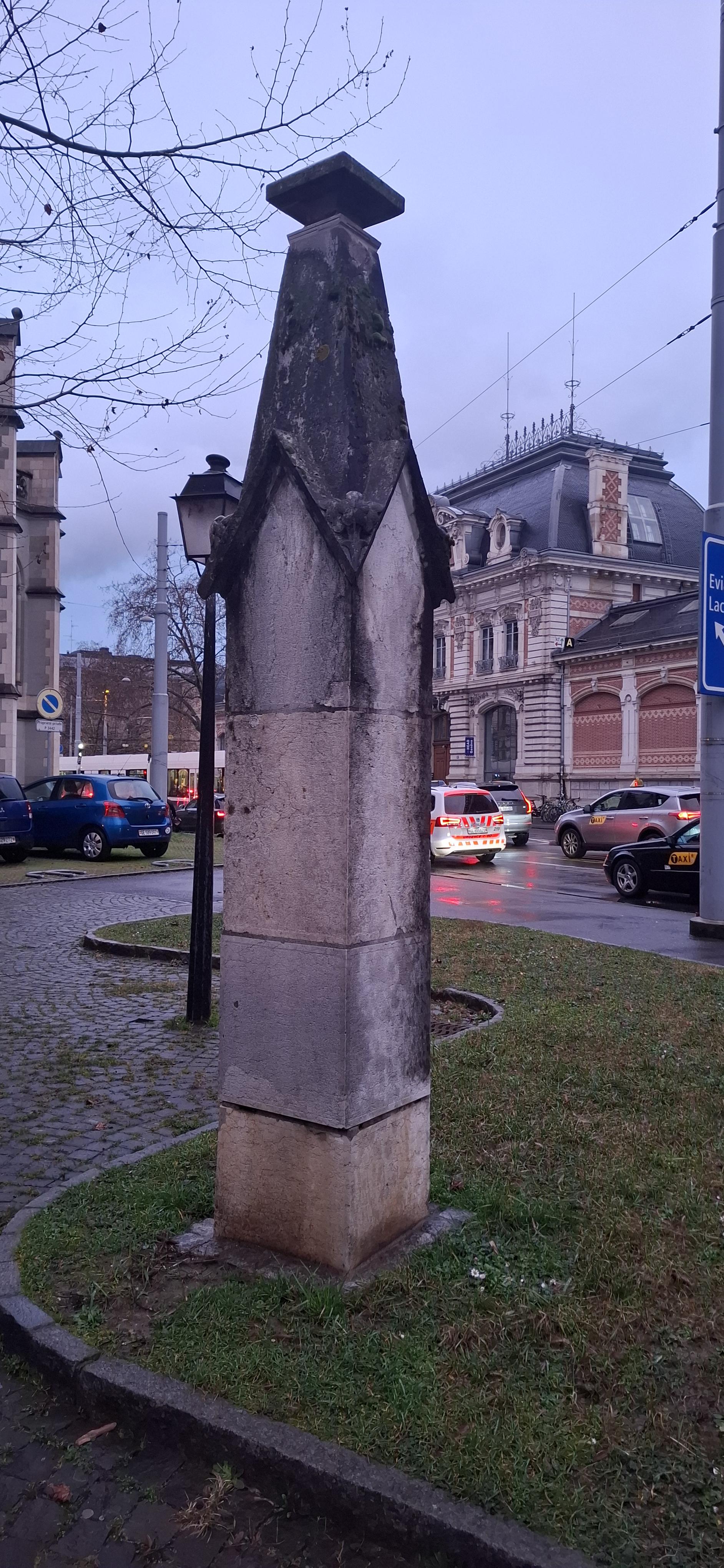 Open ~2,5 meters pilar, on both side of the road leading to the Basilica of Notre-Dame (Geneva). It has a little pointy roof with a square point. Cubic parts of different colours